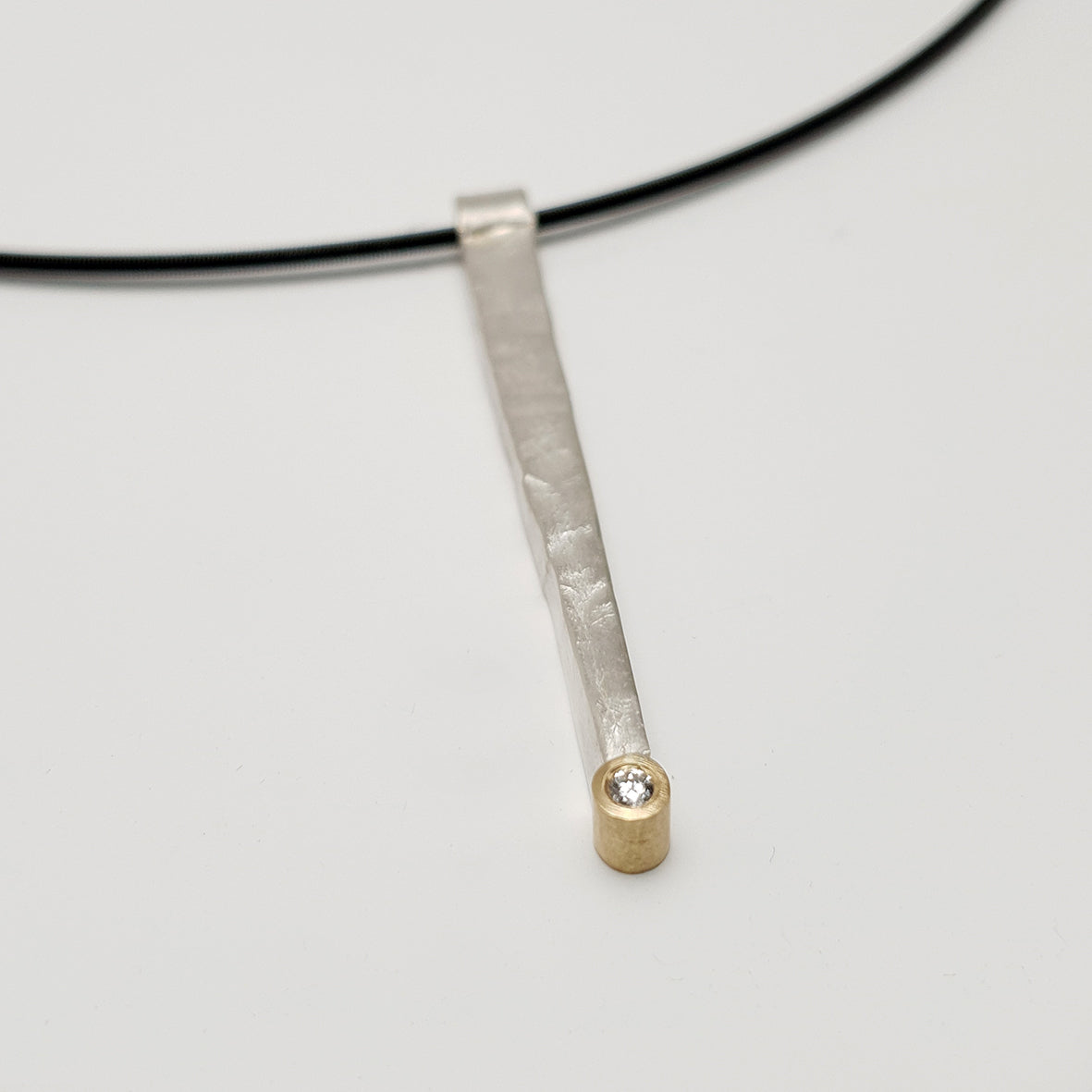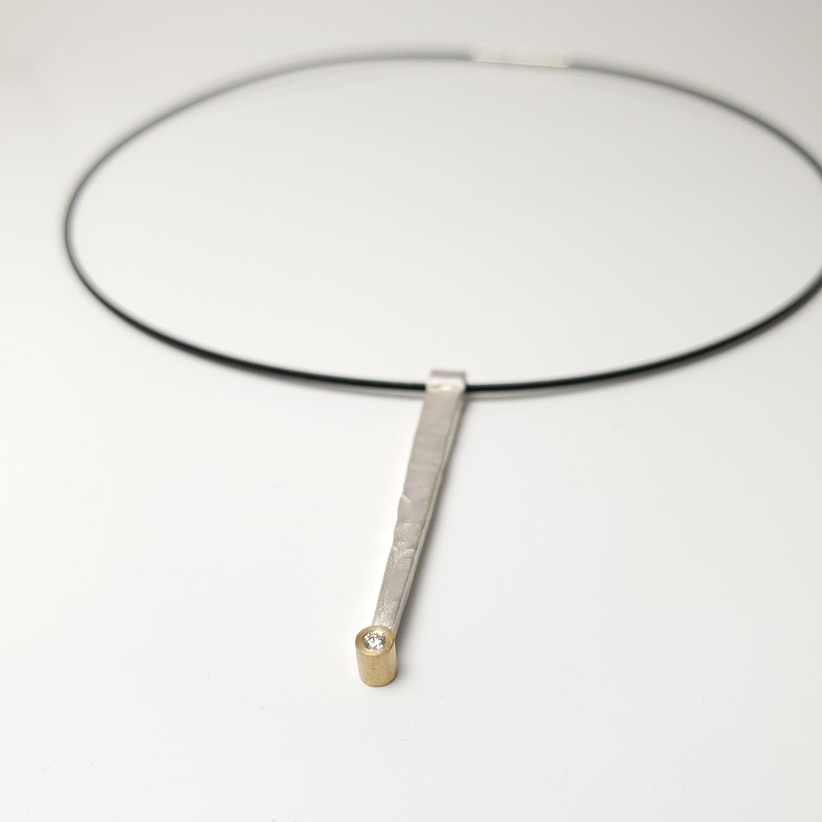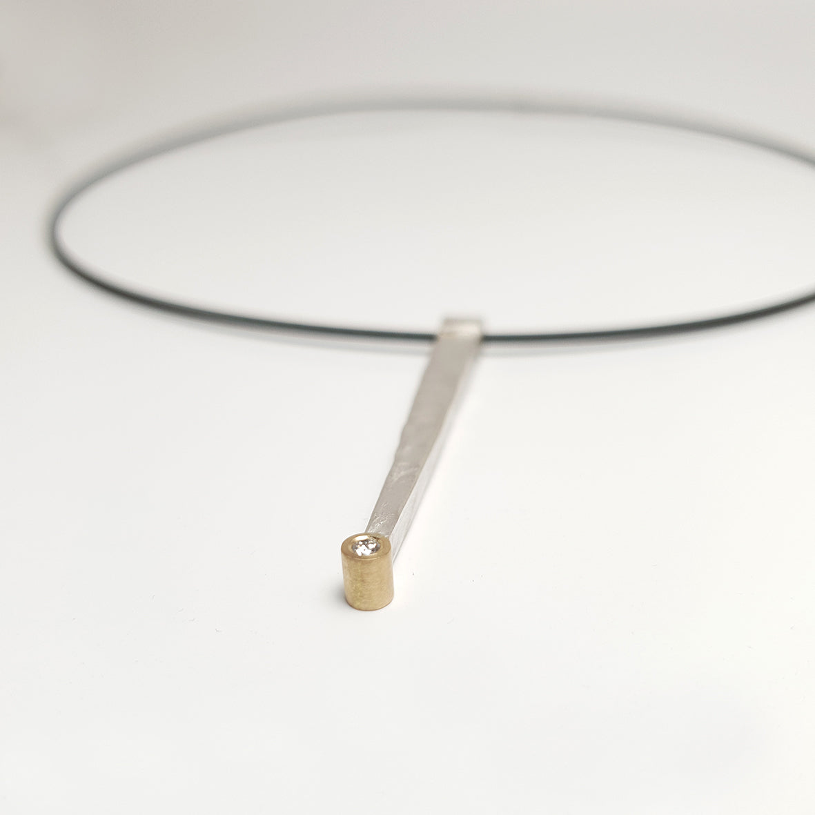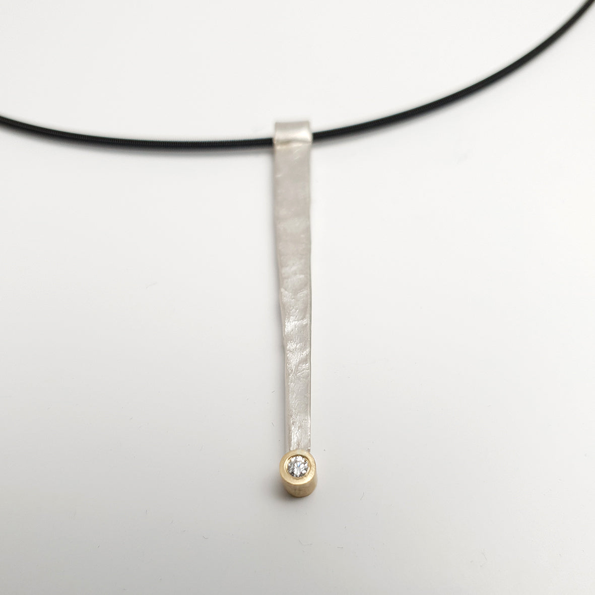The pendant in this photograph is made of silver, yellow gold and a 2 millimeter diameter diamond. We assemble it with steel cable of three measures and two colors.