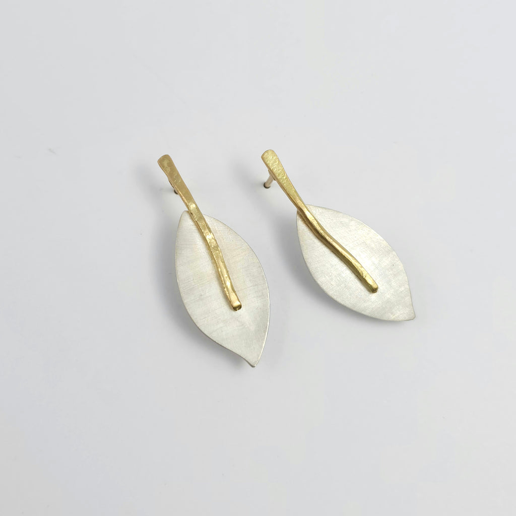 Piezas sencillas de plata y oro amarillo. Pendientes en forma de hoja. La longitud total es de 32 milímetros.