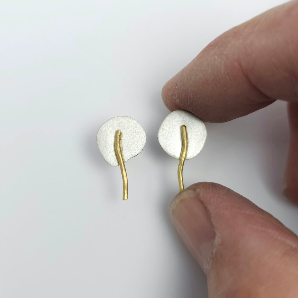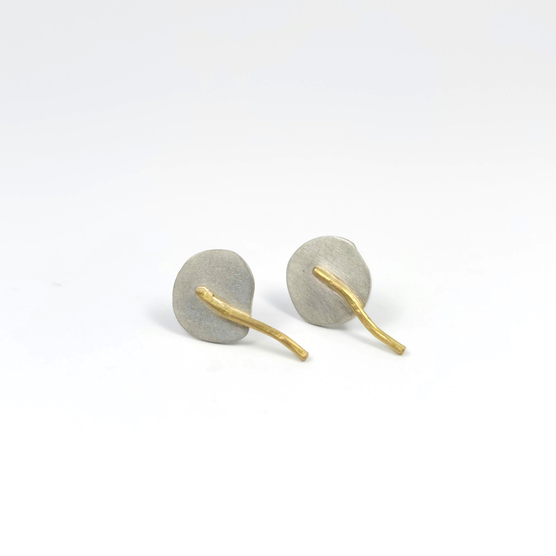 Piezas sencillas hechas de plata y oro amarillo. Pendientes de forma redonda. La longitud total es de 18 milímetros aproximadamente.