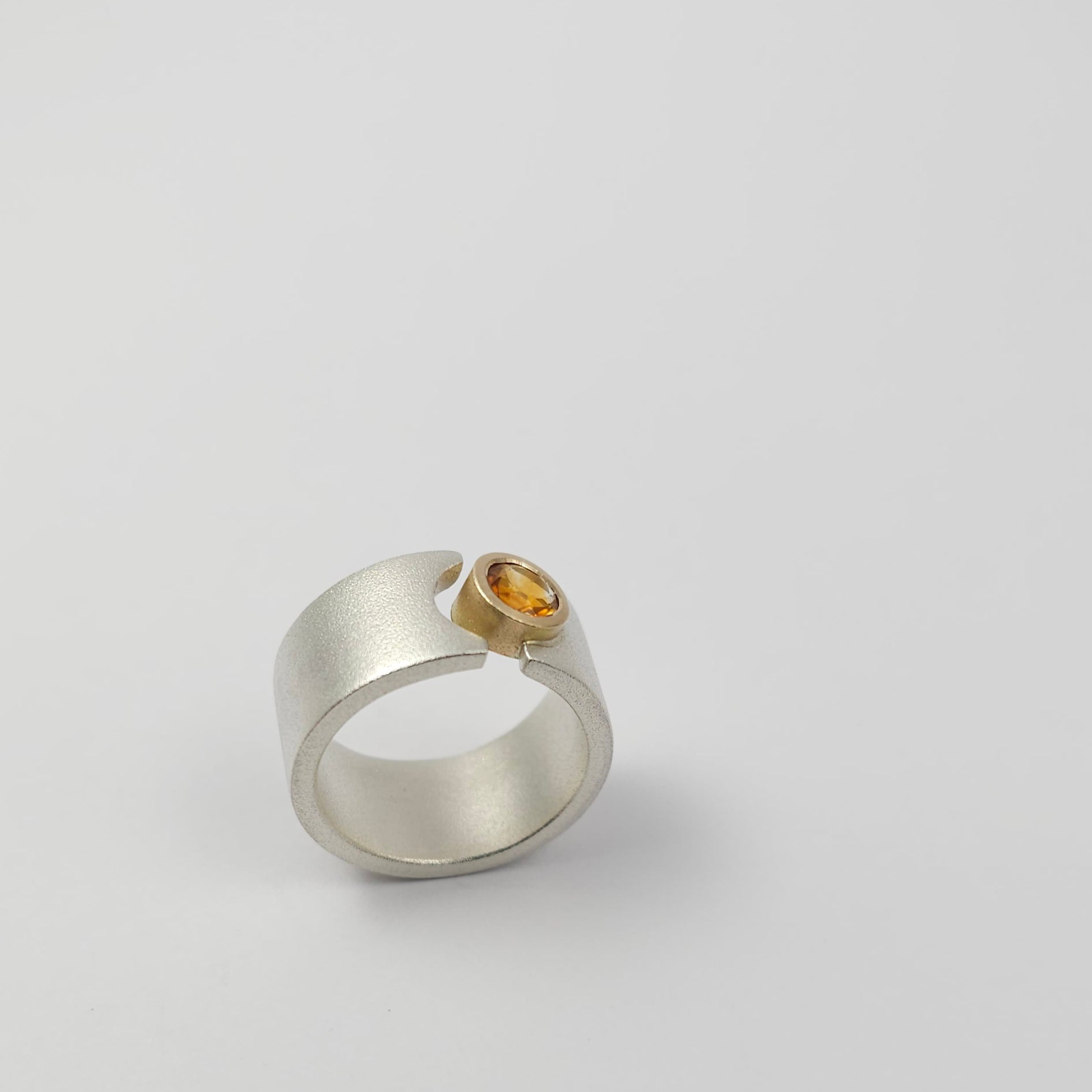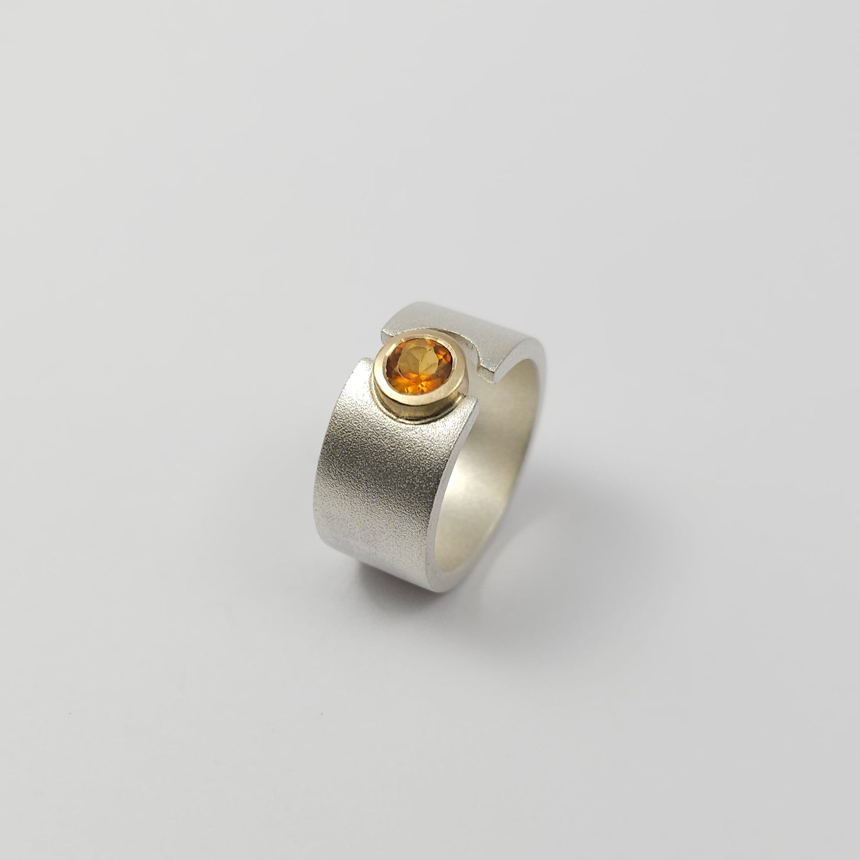 Peça única. Un anell fet amb plata sorrejada i or groc. La pedra és un citrí de color marró ataronjat de 5 mil·límetres de diàmetre.